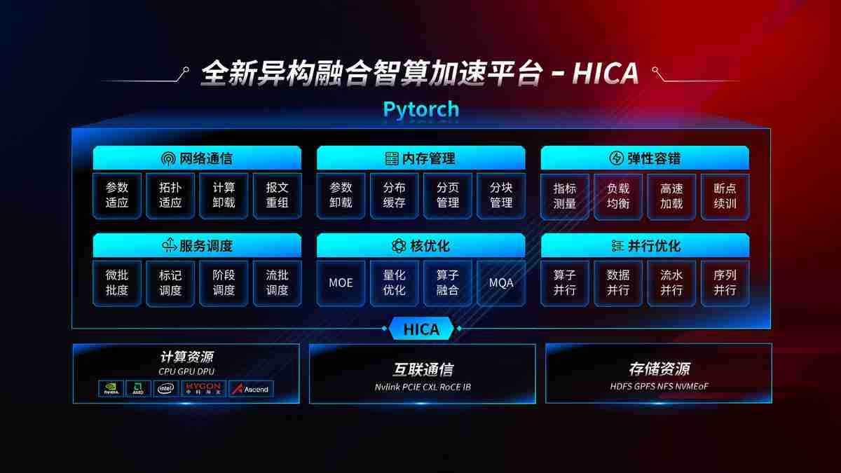 通过自研的服务层、、、、中间适配层、、以及调度编排算法,,采用数据并行、、模型并行等多种并行方式,,,,把并行计算任务进行有效的分解,,,使其分别由相应的软件栈和算力资源来承接。。。。当GPU资源变化,,,HICA可以实时动态调度计算子任务并调整模型拓扑和架构,,,以充分聚合各种算力资源。。。