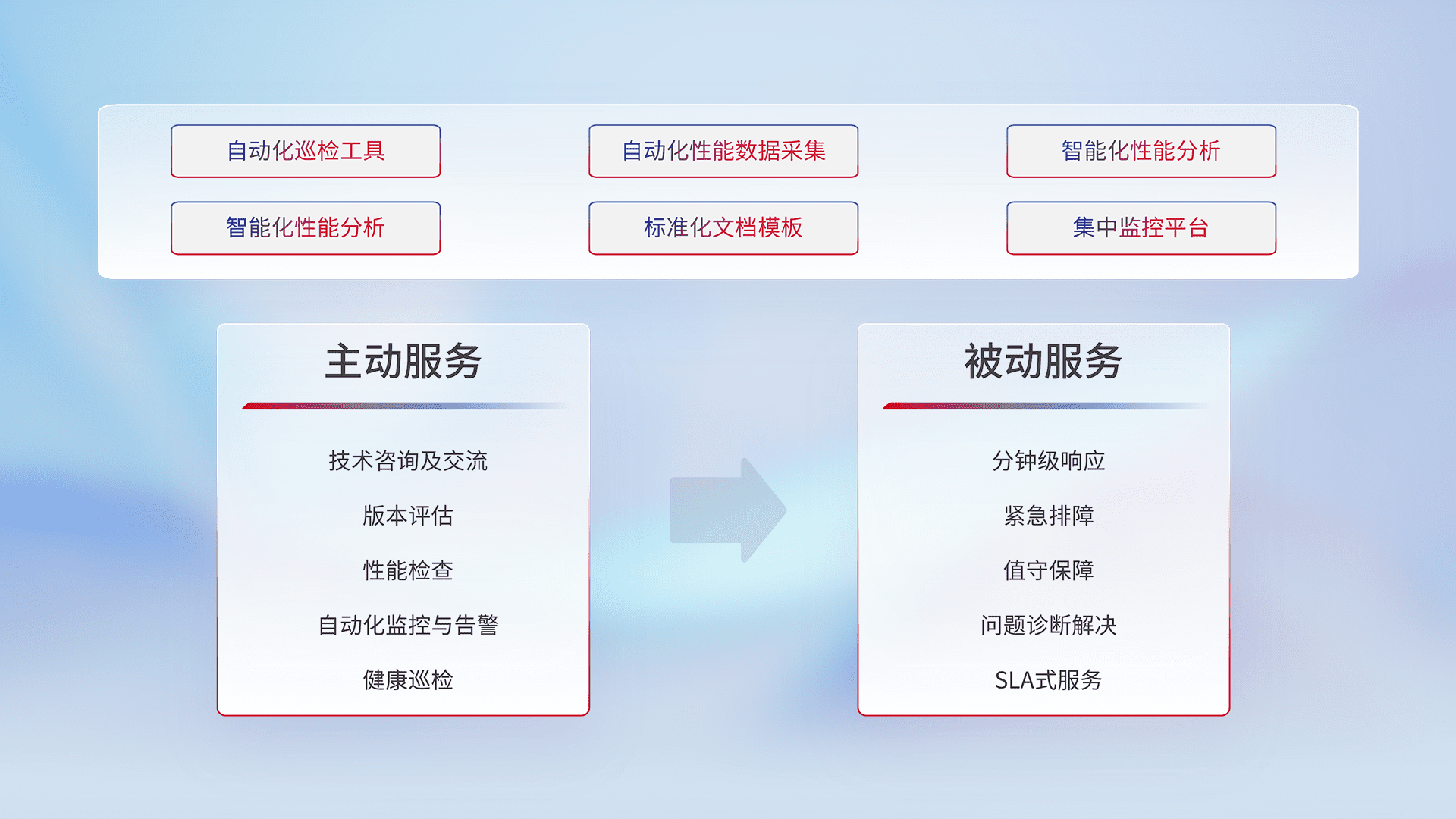 智能化工具和标准化文档,,,,保障服务质量,,,,提供主动服务(包含技术咨询、、版本评估、、、性能检查、、自动化监控与告警、、健康巡检)和被动服务包含(分钟级响应、、紧急排障、、、、值守保障、、问题诊断解决、、、SLA服务)。。。